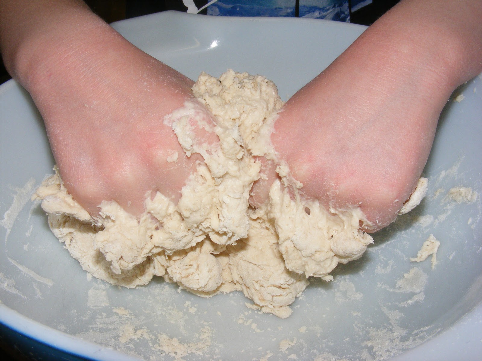 We started off with our flour, salt, baking powder, milk (I use almond milk), and, of course, our baking soda. We had our science lesson for the day, and learned that the soda takes the place of yeast and causes the bread to rise. But since it rises quicker than yeast, the bread is done more quickly. Also, since the soda doesn't give off gas like yeast, soda bread doesn't have holes in it like yeast bread, and it it much more dense.